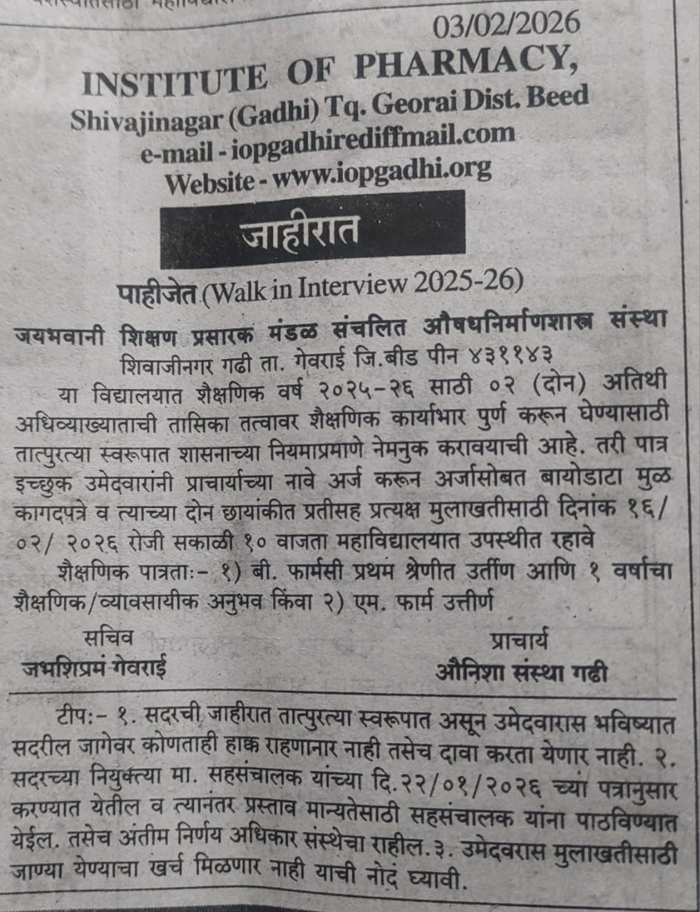 Advt: Walk In Interview Dt. 3/2/26