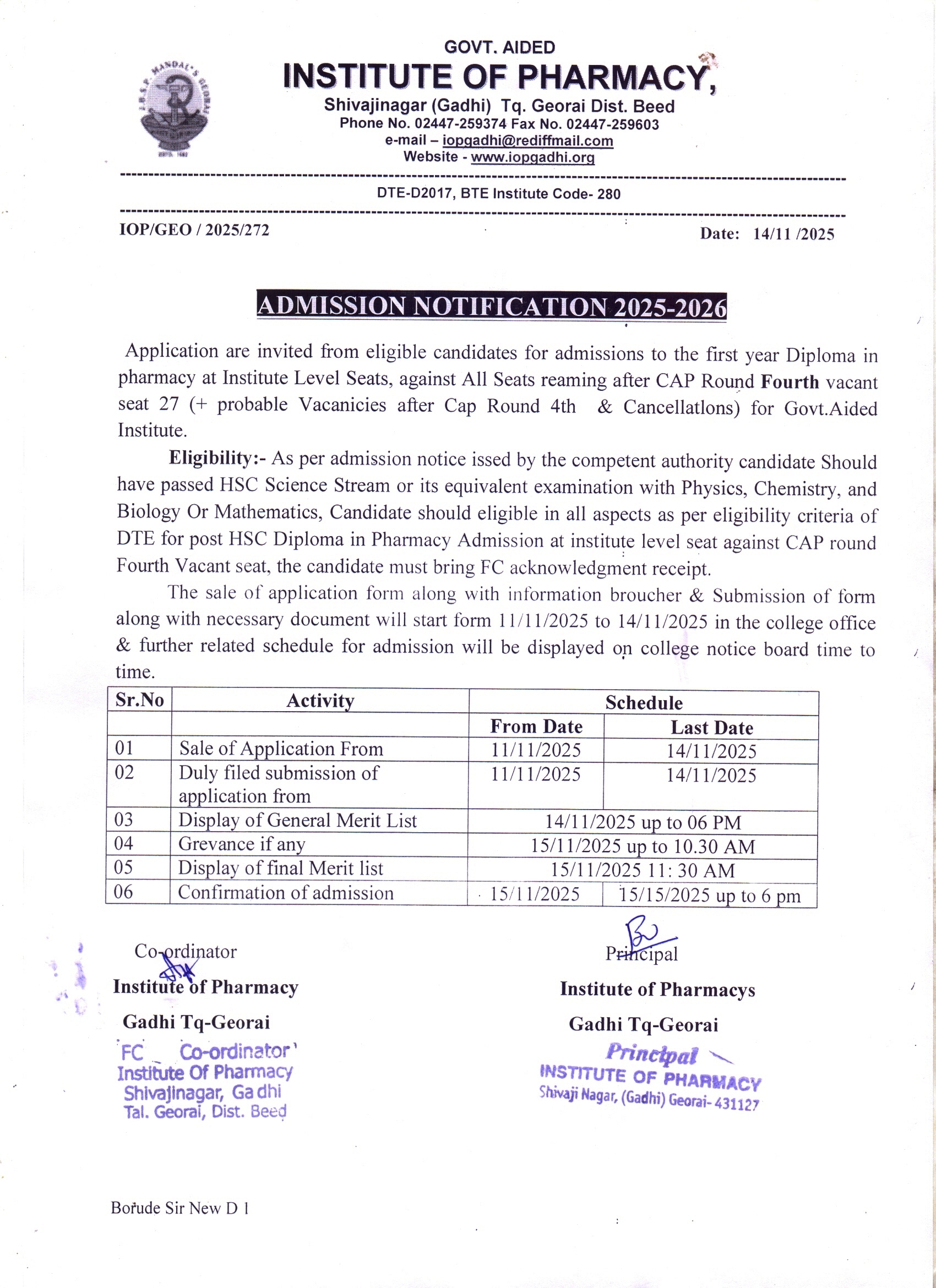 Advt : Admission Notification 2025-26